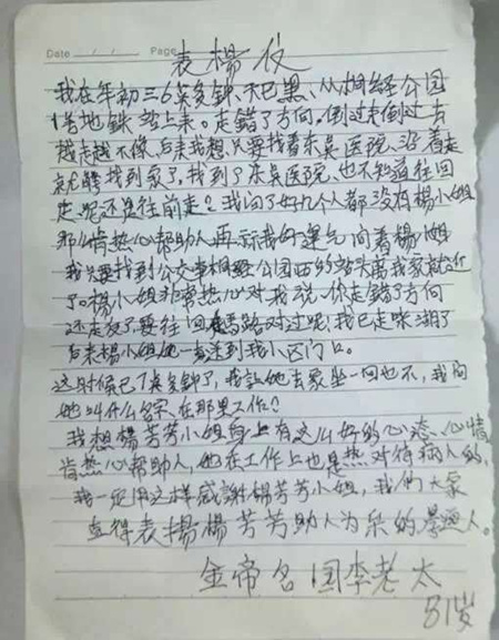 感谢信上的字歪歪斜斜但每个字却一笔一画,看得出来这整整一页纸的字费了这位81岁的老人不少心血。她没有找人代笔,她想让自己的每个字都注入“真诚的感谢”。她说:“我不知道如果没有遇到她,我会在那么冷天气的晚上还要在外面迷糊的走多久才能回到家……”