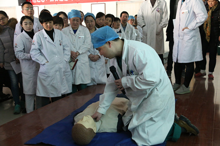 随后,麻醉科主任徐长贵讲解了心肺复苏的基本理论知识,重点讲述了心肺复苏术的基本原则、方法以及详细的操作流程。理论知识讲解后,又在现场为医护人员对心肺复苏的实践技能进行了详细的讲解和规范的操作演示,确保现场的每位医护人员都能操作,并且规范熟练地掌握心肺复苏术。徐主任表示,心肺复苏是医护人员必备的技能之一,通过现场医护人员的练习看来,已都能较好的掌握技能要领。