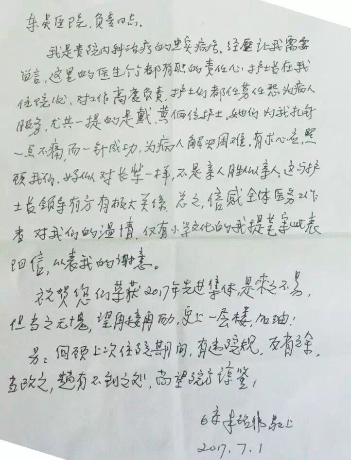 昨天朱爷爷特别在出院前写了一封感谢信,感谢他的主治医生、照顾他的两位护士和护士长。在信里尤其提到了要感谢戴梦莹和黄莹两位护士的亲切照顾,不是亲人胜似亲人,给朱爷爷带来了温暖。