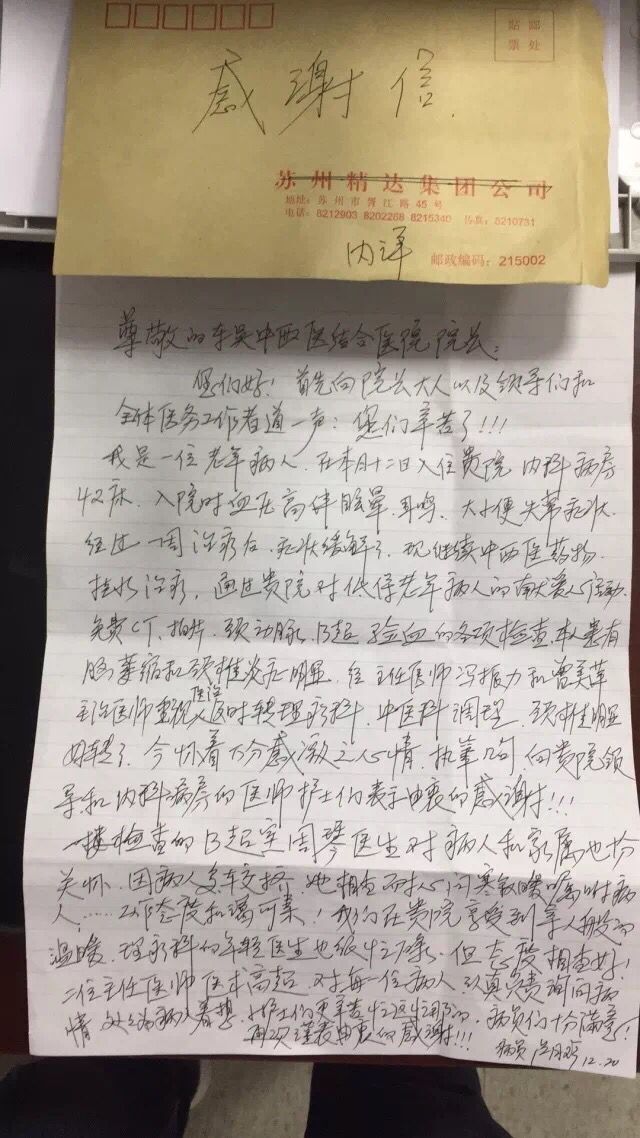 昨天,苏州东吴中西医结合医院三楼住院部的一对夫妻患者给医院寄来了一封感谢信。