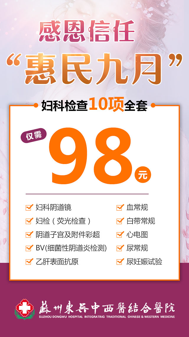 苏州东吴中西医结合医院妇科开展“感恩信任 惠民九月”公益活动,妇科10项检查仅需98元,详情如下: