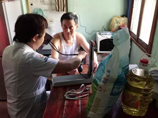 据虹桥社区居委会介绍,小区里有位沈耀华老人患有高血压、糖尿病、脑中风,目前行动不便,反应迟钝,东吴义工队成员当即决定送医上门服务。来到沈耀华老人的家中,东吴医疗义工队的江岩医生为老夫妻俩做了详细的检查,并叮嘱了高血糖、糖尿病等疾病的日常注意事项。临走时,东吴义工队特意为老夫妻俩送上了一桶油和一袋大米以示关怀。